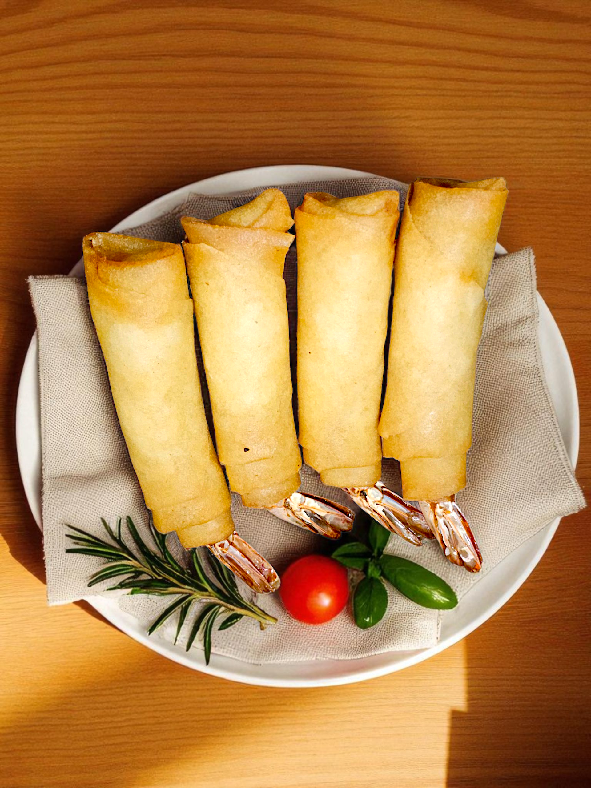 4 spring rolls each stuffed with a whole shrimp
